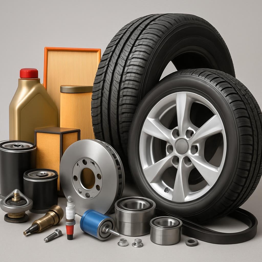 Automobilių dalys, padangos, ratlankiai, eksploatacinės medžiagos.